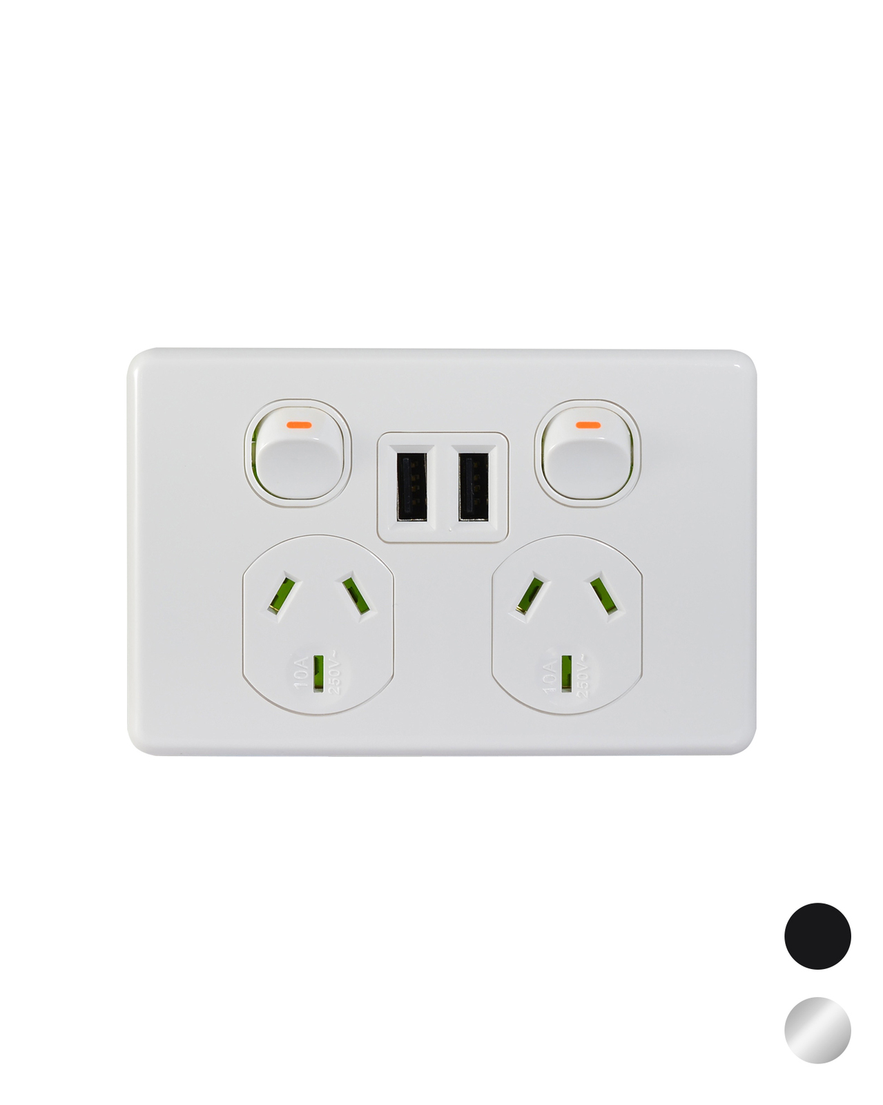 Dual switched integrated 250V a.c. power point outlet rated at 10A with twin USB sockets for power supply that is ideal for living areas, kitchens, bedrooms, hotels, libraries and waiting areas.